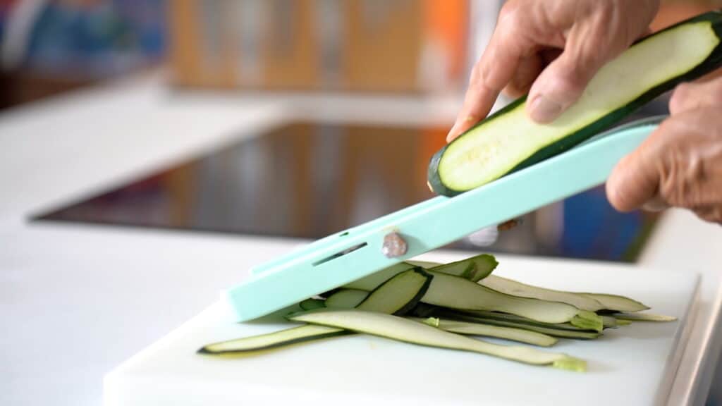 - Wash and dry the zucchini, and cut off ends. Then with the help of a mandoline or a sharp chef knife, and slice it lengthwise into thin 4mm sheets without reaching to the core of the zucchini (use firm flesh only).