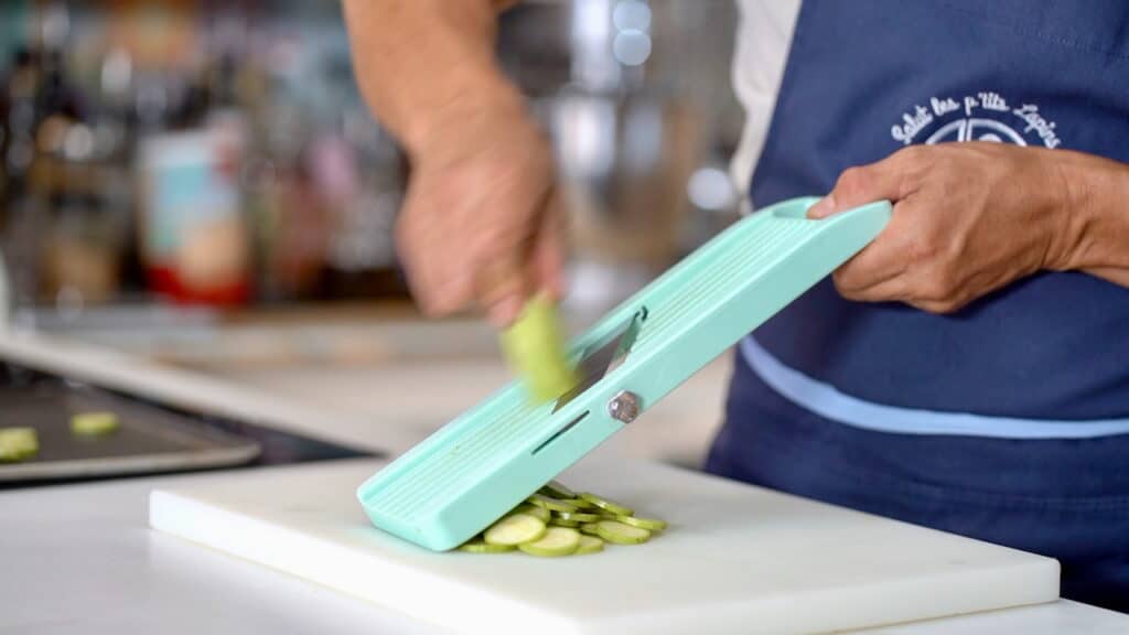 - If using the mandoline, leave the stems and cut into rounds. Spread zucchini rounds onto a baking tray, and leave them at room temperature overnight to dry out.