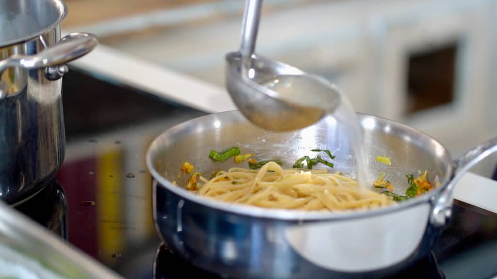 - Meanwhile, in the sautoir, gather minced zucchini flowers along with basil, and cold butter (Add fried zucchini if you have chosen the traditional way to do so). Turn on the heat, add the pre-cooked pasta and about a third of a cup/80g of simmering pasta water. Stir up pasta mixture using the long cooking tweezers or tongs, shacking the pan every so often. Add more boiling water as pasta releases its starch and are becoming al-dente; about 5 minutes later. Meanwhile, quickly reheat zucchini linguine in the hot pasta water, and drain.