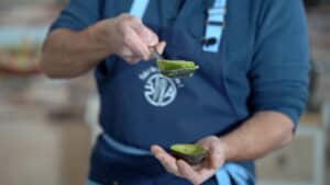 - For recipes, use ripe avocados with no black spots or stringy texture. Remove the flesh from 2 ripe avocados. Weigh the amount needed for each preparation, then cut into chunks.