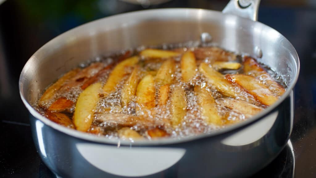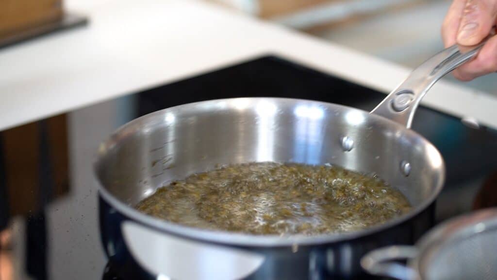 - In a saucepan, bring up some neutral oil to 375ºF/190ºC. Chop capers. Deep fry capers for about 3 minutes. Drain and keep fried capers on paper towels.