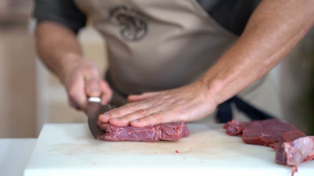 - Remove excess fat, sinew, and connective tissue from the meat. Cut steak into scallopini, strips and dices.