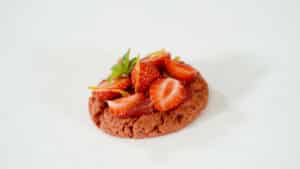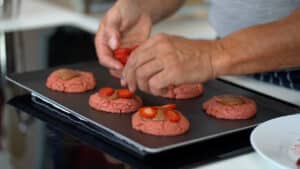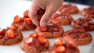 - Top each cookie with a teaspoon of strawberry caramel. Top caramel with 3 slices of strawberry. Put cookies back in the oven for 8 minutes more. Avoid any excessive coloring. These cookies are best slightly underdone.