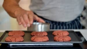 - When ready to bake, arrange 6 cookies per tray. Leave cookie out for 30 minutes, and gently flatten. Preheat oven to 320ºF/160ºC. Pre-bake cookies for 8 minutes. Remove from the oven, and shape each cookie into neat round with the help of cookie cutter.