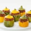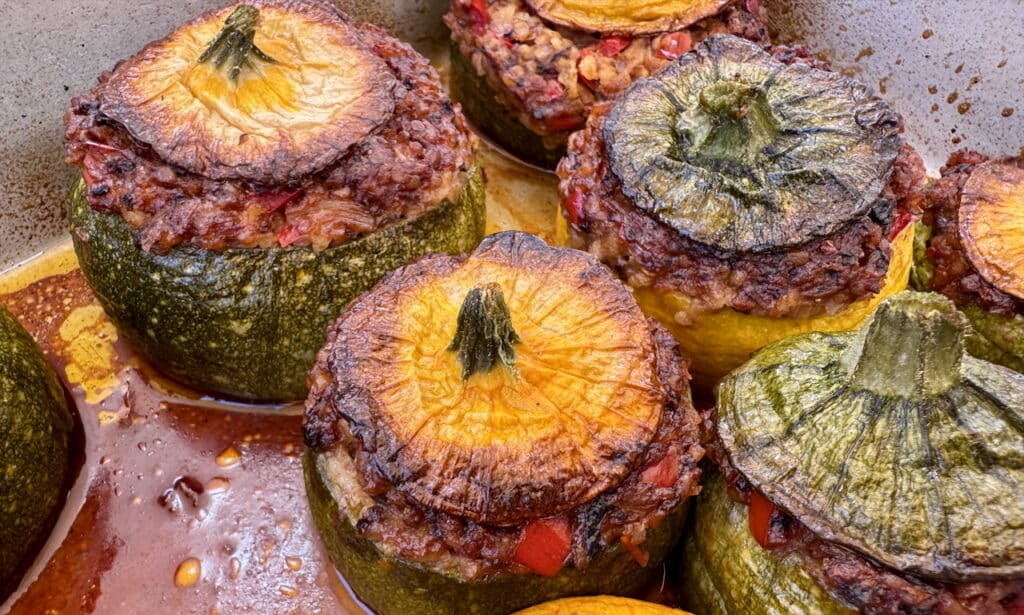 These perfectly cooked round zucchini are a summer delight—tender yet firm, stuffed with a vibrant bulgur-tapenade and a sweet, herbaceous bell pepper-tomato-basil mixture. Each bite delivers a burst of Mediterranean flavors, with the nutty chew of bulgur, the briny depth of olive tapenade, and the fresh brightness of roasted vegetables.