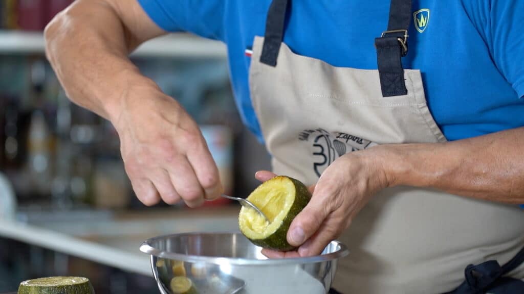 - Next, remove the pulp with a tablespoon. Save pulp to make a delicious Zucchini-Basil Gazpacho.