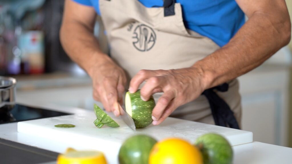 - Preheat fan oven to 350ºF/180ºC. Begin by washing vegetables thoroughly under running water to remove any dirt. To ensure the zucchini sit flat and stable during cooking, trim a thin slice off the bottom. Next, carefully cut off the tops—about ½ inch down—and set them aside to use as "lids" later. Season the inside with salt. Cook zucchini bodies (cut side down) for 30 minutes, flip zucchini and cook for 10 minutes more. Let cool before scooping flesh out.