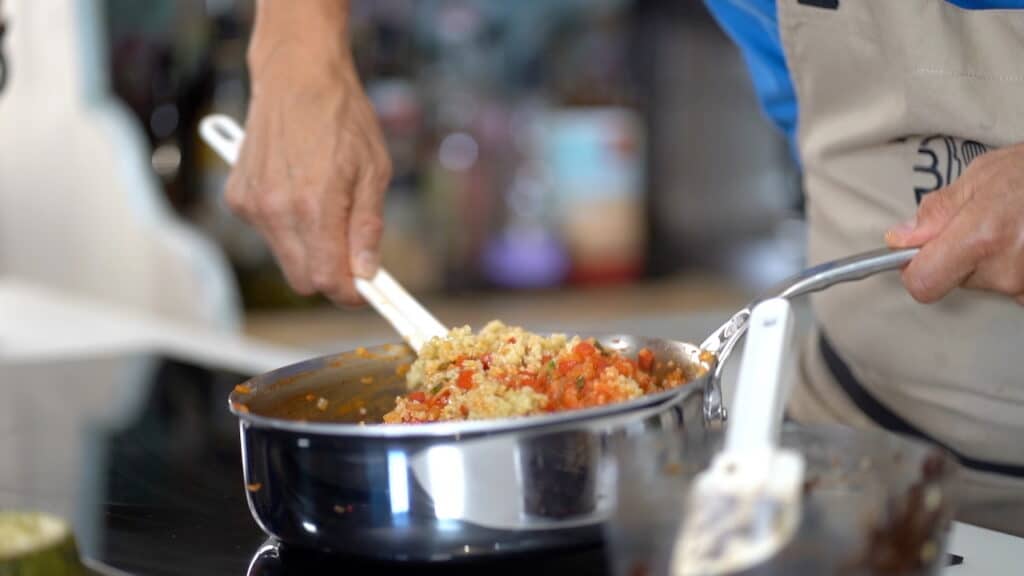 - In a large skillet or sautoir, begin to sweat the chopped onions along with the diced bell pepper in olive oil. Add a sprig of thyme and a couple of bay leave. Cook for 10 minutes on medium heat. Add garlic and cook until fragrant.