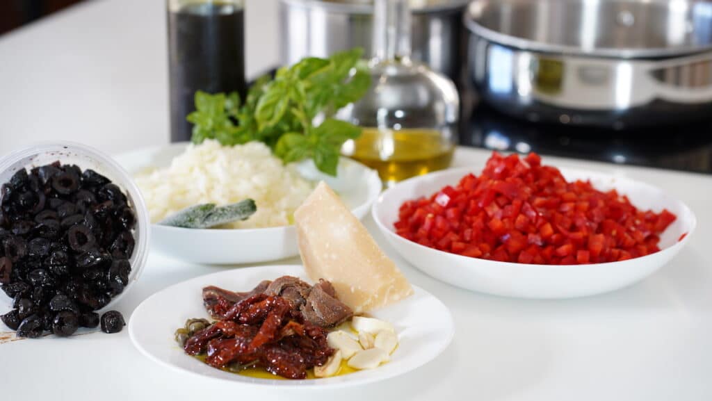 - In a food processor, pulse the olives, capers, anchovies, sun-dried tomatoes, and garlic until roughly chopped. With the processor running, slowly drizzle in the olive oil until the mixture becomes a coarse paste (not too smooth). Tapenade can be stored for up to 2 weeks in the refrigerator.