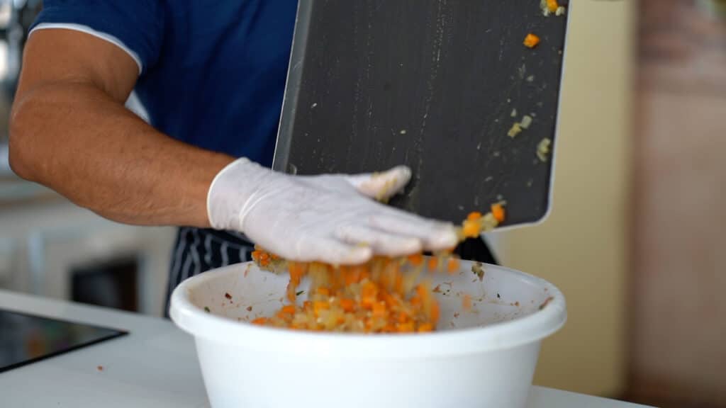 - Place a baking tray in the freezer. In a hot frying pan, add oil and sauté carrots and onions for 10 minutes. Season with salt and pepper to taste. Add the minced garlic, and cook until fragrant. Deglaze with Chardonnay, and continue to cook for 5 minutes until moisture is gone.