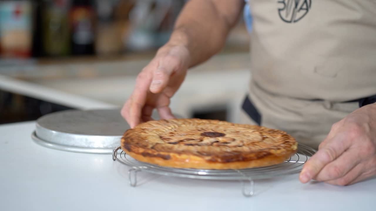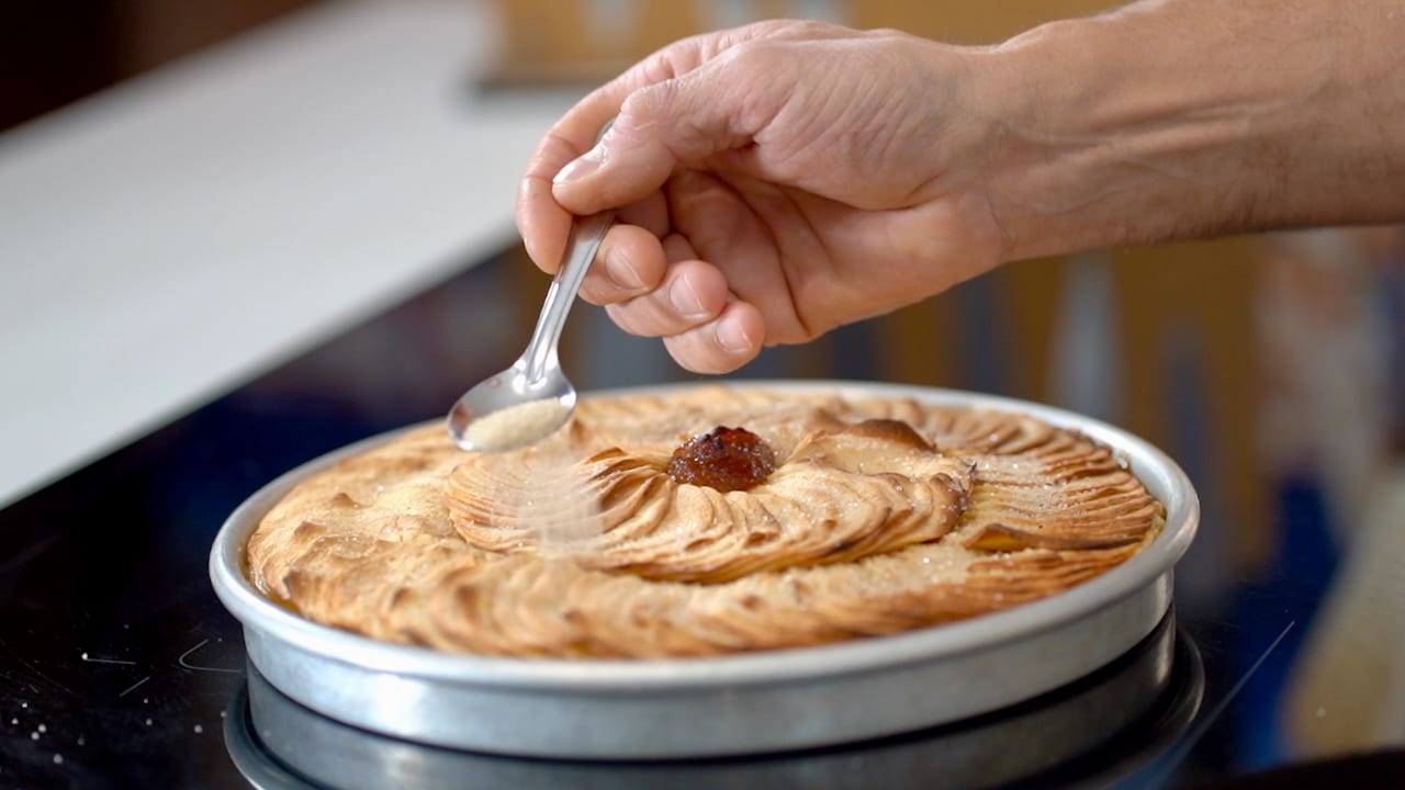 - Preheat a convection oven to 350ºF (180ºC) for 30 minutes, with a pizza stone placed inside to heat. Bake the pie for 50 minutes. Remove the pie and immediately dust it with vanilla sugar or raw sugar. Dot the top with small pieces of butter if desired. Return the pie to the oven and bake for an additional 10 to 15 minutes.Remove from the oven and let the pie stand in its pan for 10 minutes. Carefully de-mold it, then transfer to a wire rack to cool completely.