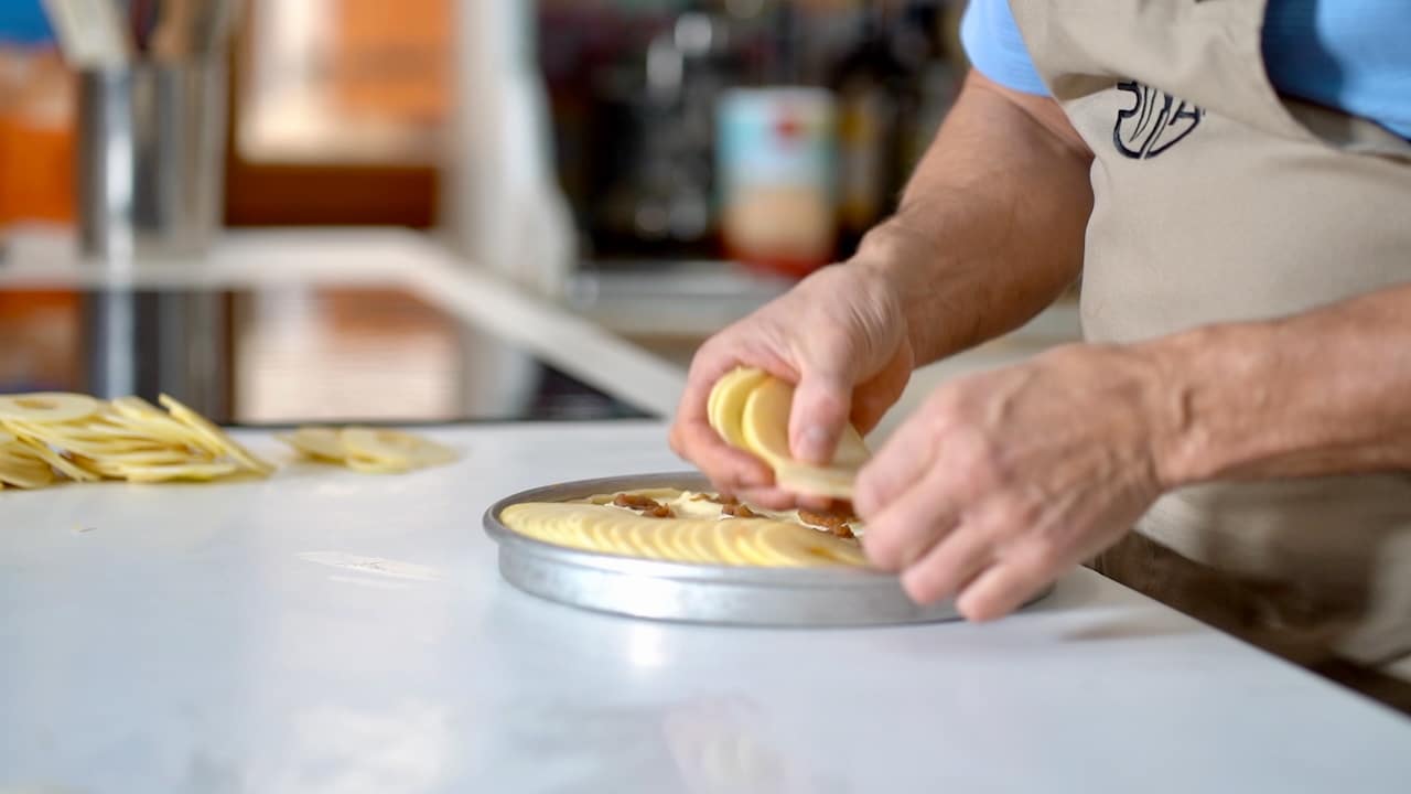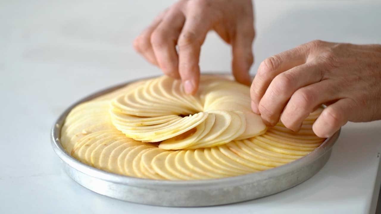 - Peel, core, and slice the apples using a mandoline or a sharp knife. Arrange the slices into two tightly packed, concentric circles.