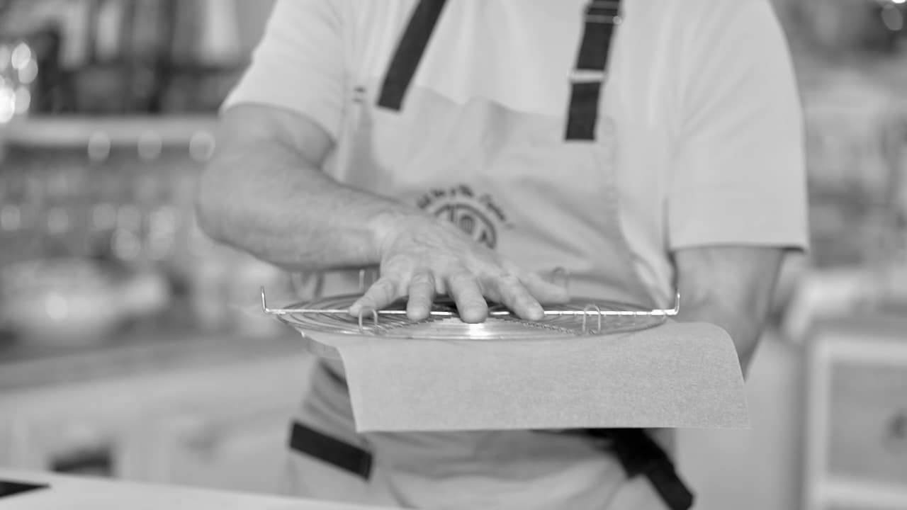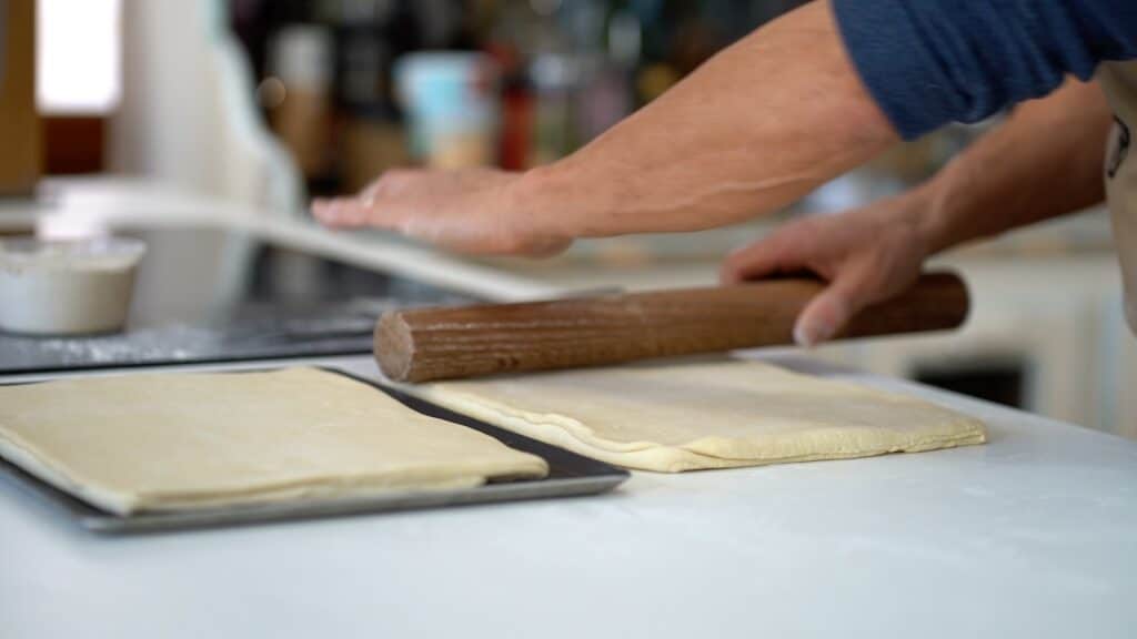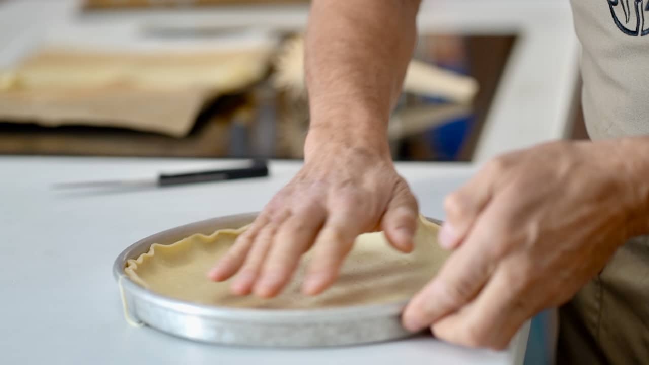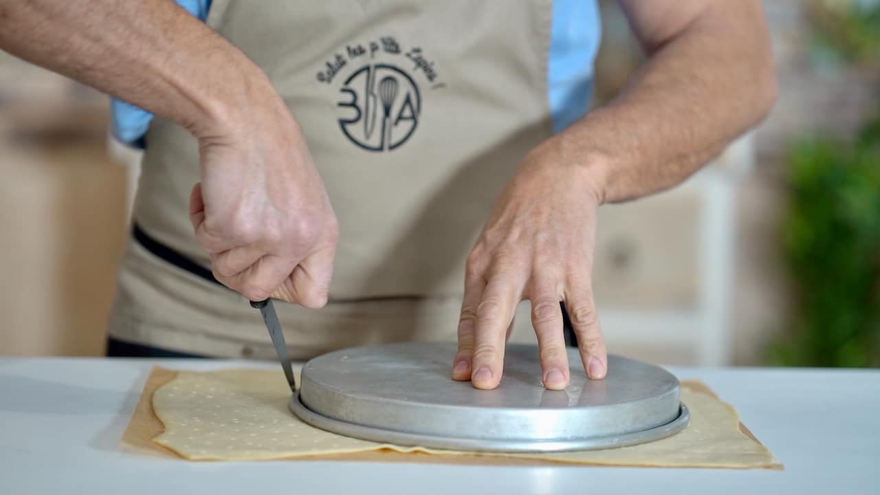 - Grease the bottom of the pan and line it with a round of parchment paper. Place the chilled and thin puff pastry sheet on a surface and dock it all over with a fork or dough docker. Use the upside-down pizza pan as a guide to cut the pastry into a round.