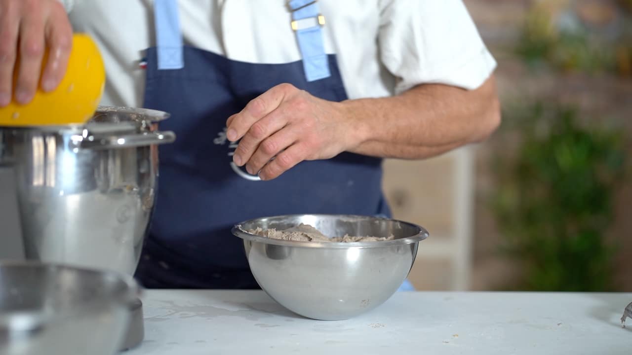 • Add the natural starter cut into pieces and the yeast, and mix on medium speed for 8 to 10 minutes, stopping to scrape down the sides of the bowl as needed.