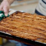 - Preheat your fan oven to 400ºF (200ºC) with the pizza stone inside for 25 minutes before putting the pie in. Combine the sugar with the vanilla sugar, and sprinkle it all over the fruits. Place the pie in the oven, then immediately reduce the temperature to 345ºF (175ºC). Bake for 75-80 minutes, rotating the tray halfway through. Let the apple pie traybake cool for 10 minutes and carefully slide it onto the cooling rack.