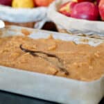 - Wash the apples. Cut each apple into quarters and remove the core and stem. Slice each quarter in half lengthwise. Place the apple pieces in a large, shallow baking dish. Add water and sugar. Cover the dish tightly with aluminum foil or a baking tray. Bake at 330°F (160°C) for 1 hour, or until the apples are very soft. While still hot, carefully pass the cooked apples through a food mill or ricer into a clean bowl to create a smooth puree, discarding the skins. Return the apple puree to the shallow dish. Stir in the vanilla bean and seeds or extract. Bake the sauce, uncovered, for 25 minutes. Stir with a spatula halfway through. Turn off the oven. Leave the dish inside with the door closed for a few hours, or preferably overnight. This allows moisture to evaporate, firming the texture and concentrating the flavor. Once cooled, taste and add more sugar if desired. From 2.5kg of raw apples, you will yield approximately 1.75kg (1750g) of applesauce.