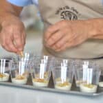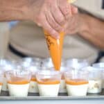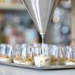 - Fill each dessert cup about ¼ of the way with rosemary mousse, ensuring an even base. Place a piece of dacquoise and pistachio crunch on top of the mousse.