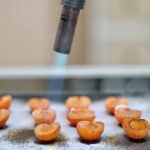 - Dust powdered sugar over apricot halves, and sightly burn them with the blowtorch. Sprinkle some toasted and crushed pistachios. Enjoy!