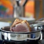 - When the pan is hot, add duck fat or neutral oil and sear the meat 5 minutes on each side on medium high heat. Preheat your fan oven to 330ºF/160ºC.