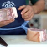 - Season pork chops heavily with grey salt. Heat up the pan.