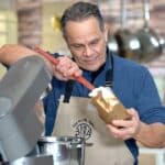 - Combine and sift together: flour, baking powder and baking soda. In the stand mixer fitted with the paddle attachment, beat the softened butter along with sugar and salt. Add one egg, and continue whipping. If the mixture looks grainy or separates, quickly warm up the mixing bowl over a bain-marie or use your kitchen blowtorch. Once the mixture comes together, add about a quarter of the sifted powders. Incorporate the remaining egg, and the banana mixture.
