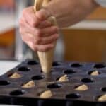 - Preheat fan oven to 330ºF/160ºC. Fill prepared pans 2/3 full (≈700g batter).