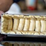 - Peel the firm bananas and carefully cut them lengthwise in 2 to cover the bottom pan, and cut into 3 to cover the sides.