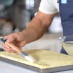 - When the sabayon champagne is at 77-81ºF/25-27ºC, and with the mixer, incorporate one-third of the whipped cream into the sabayon. This initial fast incorporation helps to lighten the base and stabilize the emulsion. Stop mixer. Then, fold the remaining whipped cream by hand, and with the whisk.