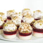 - Note: In cups the amount of gelatin in the red fruit soft jelly should be reduced by half. Layers are: 55g mousse, 15g red fruit soft jelly, 10g sponge, 20g meringue and toasted crushed pistachios. Enjoy!