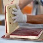 - Next, top cake with a large cutting board or cake board, and reverse. To ease un-molding, warm up the bottom tray baking using your hair dryer. Remove the baking tray and the plastic that touches the red fruit soft jelly.