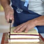 - Slice the frozen cake in half. Return it to the freezer for a minimum of one hour before assembling the layers.