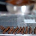 - Submerge the peel completely into the tempered chocolate. Hold the peel over the bowl and gently tap or shake to allow the excess chocolate to drip off.