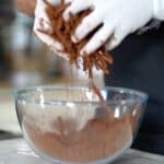 - Place the unsweetened cocoa powder in a bowl or shallow container. Add the candied orange peels to the cocoa and gently toss. Shake the peels in a sieve or tamis to remove any excess cocoa powder. Sift the cocoa powder to remove clumps and save it for future use.