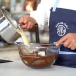 - Sieve the creme anglaise over the melted chocolate – Whisk well and let cool to 96ºF/35-36ºC before adding the whipped cream.