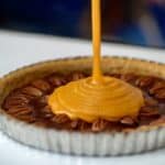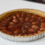 - Spread the chocolate sauce in the blind baked tart shell. Arrange pecan halves into circles.