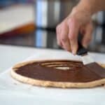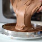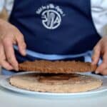 - In French pastry, “chablonner” means applying a thin layer of chocolate—usually with a brush—over a sponge or biscuit base (like in an Opéra Cake). This chocolate layer acts as a protective seal that consolidates the base, prevents it from breaking, and stops moisture from compromising its texture. Melt 50g dark chocolate, stir in about 10% neutral oil. Coat the whole surface of the Dacquoise bottom only, and chill to set.