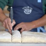 - Divide the dough slab into 6 or 8 baguettes. Lightly dust with flour between each cut.