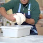 - Lay the bakers couche onto the work surface and dust flour over. Flip the container over to release the proofed dough.