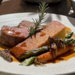 - Crispy polenta cake served with lamb rack, roasted carrots, asparagus, morels and lamb sauce.