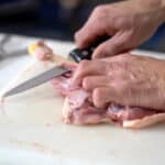 - Once the joint of the articulation is fully exposed, carefully slide the tip of your knife under and around the ball joint to sever the connection without puncturing the skin. Cut off the base of the V-shape bones.