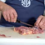 - Using the tip of your knife, start cutting the meat away from the large bone. Work from the top of the bone down to the joint, keeping the blade as close to the bone as possible to avoid wasting meat. Use your free hand to pull the meat back as you free it.