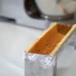 - Next, drape the inside of the mold with the prepared viennois biscuit, making sure the brown skin side is facing up. Moisturize the sponge with the passion fruit punch.