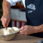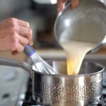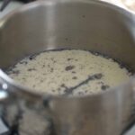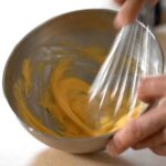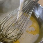 - Temper yolk mixture with ⅓ of the hot milk.