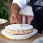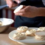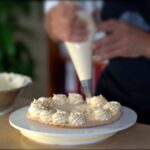 - For the base: Place the second succès (flat side down) on a flat platter. Pipe out rosettes symmetrically from noon to 6, 9 to 3, 10 to 5, and 1 to 7...