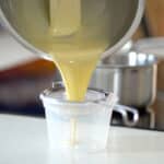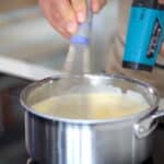 - Return the mixture to the saucepan and cook over medium-low heat, stirring constantly. Cook custard, Crème Anglaise to 185ºF/85ºC (do not boil, or eggs will scramble). If it does happen, turn off the heat immediately, and mix custard with the immersion blender.