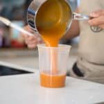 - Add food coloring, mix with the immersion blender and sieve again. In order to create a neat colorful contrast, the cake can be sprayed twice; the second coating shall be stronger in color than the first one then. To do so, divide cocoa mixture in half. Incorporate more orange food coloring in one of the container.