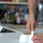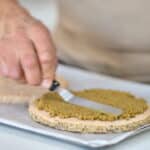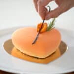 - Gently melt white chocolate over a bain-marie. Remove from the heat and stir in the pistachio butter, feuillantine and the toasted and crushed pistachios. Split in half and spread it over each frozen heart pistachio dacquoise. Keep frozen.