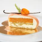 - Ladle additional mousse to cover almost to the top. Enclose mold with the frozen pistachio dacquoise (side up). Gently press down. Freeze cake overnight for for up to 3 months.