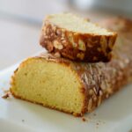 - Gently stick one small rosemary sprig toward the cake end. Add the burnished apricot halve and top with a dry vanilla pod.