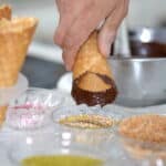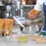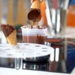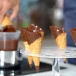 - Use chocolate enrobage at ≈113ºF/45ºC. Coat the tip of the previously frozen cone first.